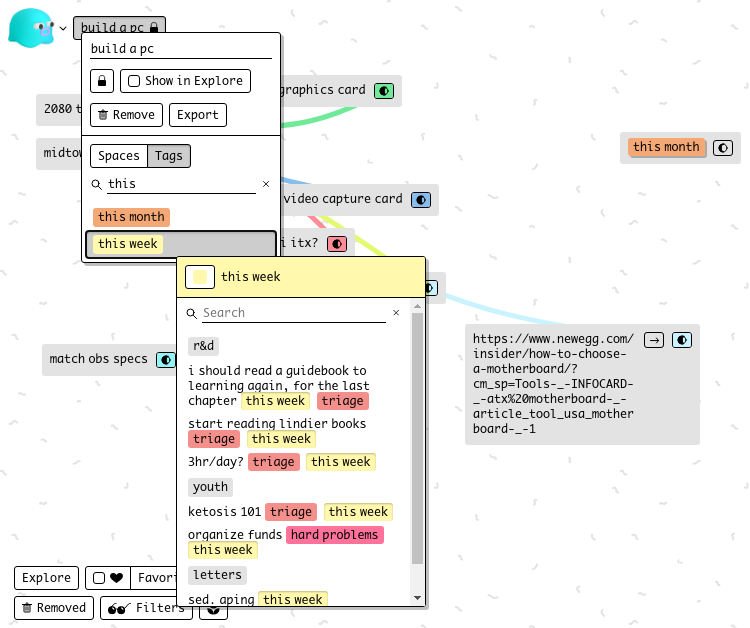 Another challenge with tagging is what exactly do I tag with? Iāve had this problem in the past with services that group by tags: how do I describe this thing in the context of a relationship to other things in a way that makes sense today and a year from now. Do I tag it with what it is (article, video) or what itās about (politics, engineering) or how it made me feel (inspiring, insightful) or how I might want to group it with other things⦠in Kinopio, I just put it near the other things Iām thinking about when I think about it. Even just thinking about effectively tagging is a burden on my puny brain.