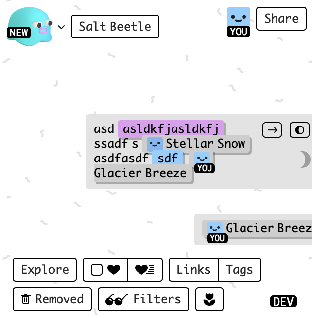 favorites is an icon because the word āfavoritesā is too long relative to how commonly useful accessing it ismove links to the same line as explore and favs because conceptually all are about across-spaces meta-navigation (or navigation-using-metadata)move tags out and connect it to links because they both v meta-navthoughts?