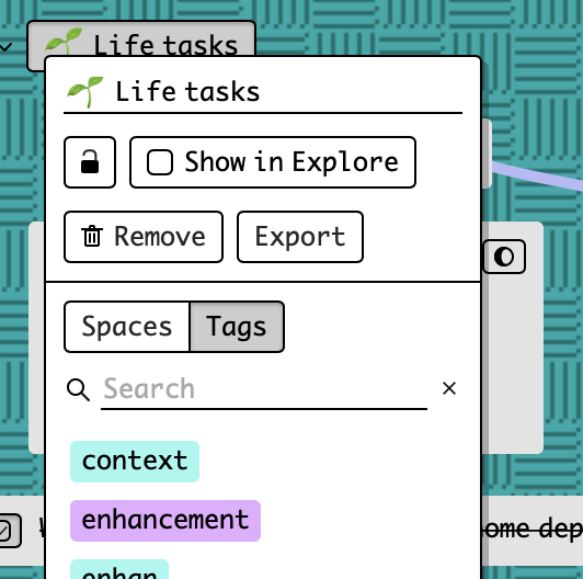 But the juxtaposition of Tags next to Spaces on the dialogue does kind of imply that tags are at least as important as spaces (kinopio philosophy), which⦠well Iām not sure what the implications are, but should they be just as important? Just another dimension to think about.